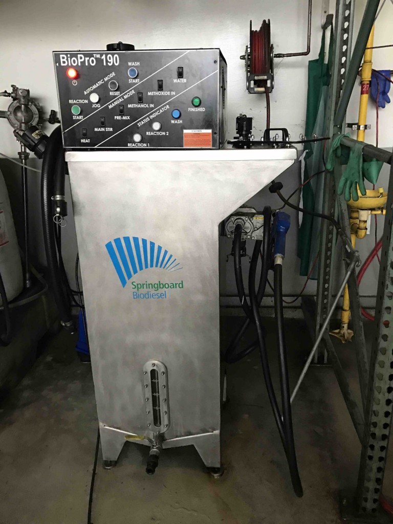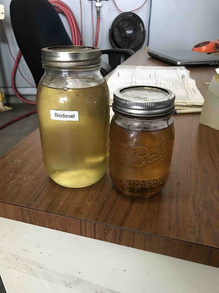 A visual comparison of the finished biodiesel and the grease it’s made from.